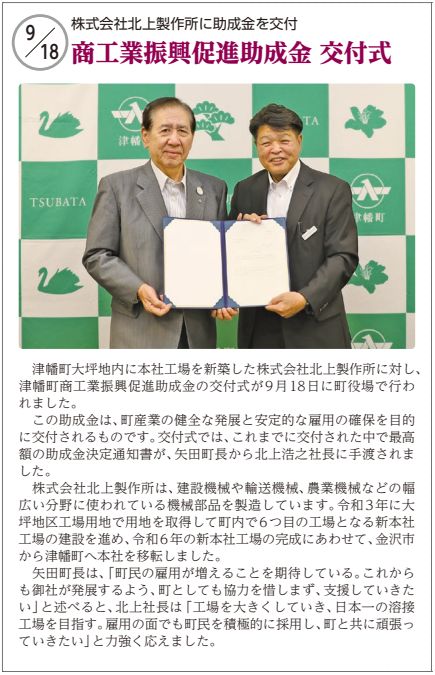 2025-09-18 お知らせ 商工業振興促進助成金が交付されました 本社工場を津幡町大坪工業団地に移転・新築し、津幡町より商工業振興促進助成金が交付されました。2025年9月18日(木)津幡町役場にて、交付式が行われました。